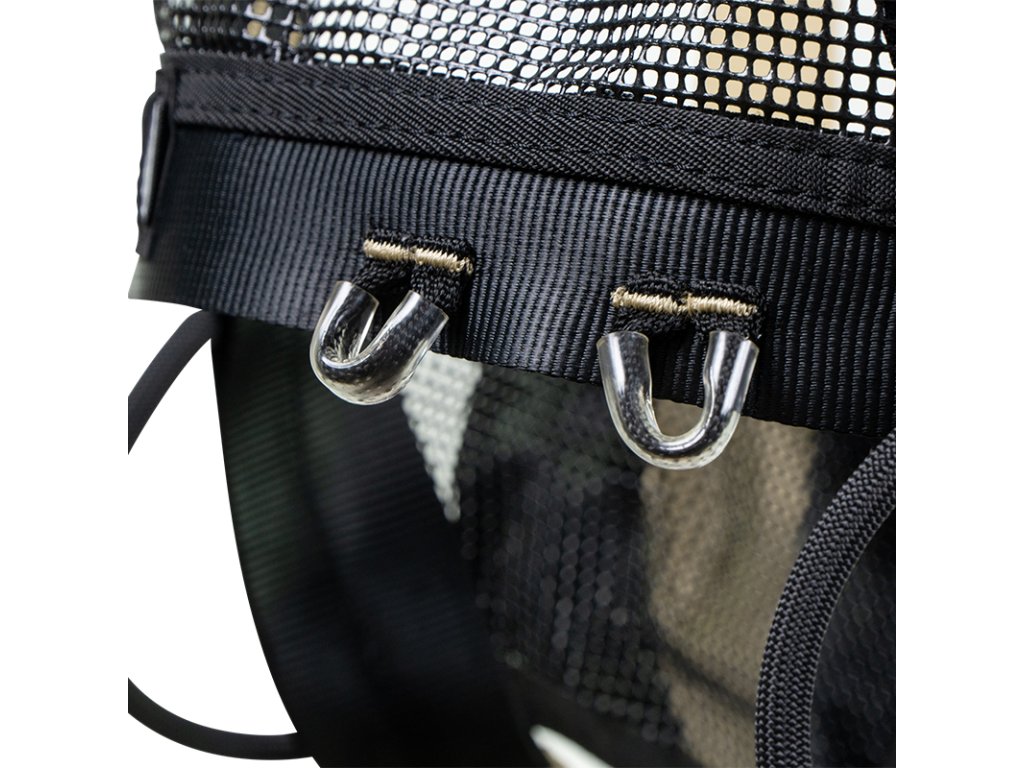 - Připojovací body: 1x zádový (D-kroužek), 1x přední (textilní smyčka), 2x boční (D-kroužky)