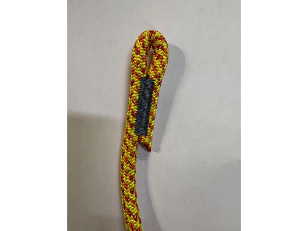 Squir 2.0 arborist rope with an 11.5 mm diameter and sewn eye is designed for professional use in arboriculture, working at height, and personal fall protection. This rope, in a striking yellow color, is a reliable tool for safe movement and positioning at heights. Its construction and material composition are optimized for demanding conditions where durability and user comfort are key.