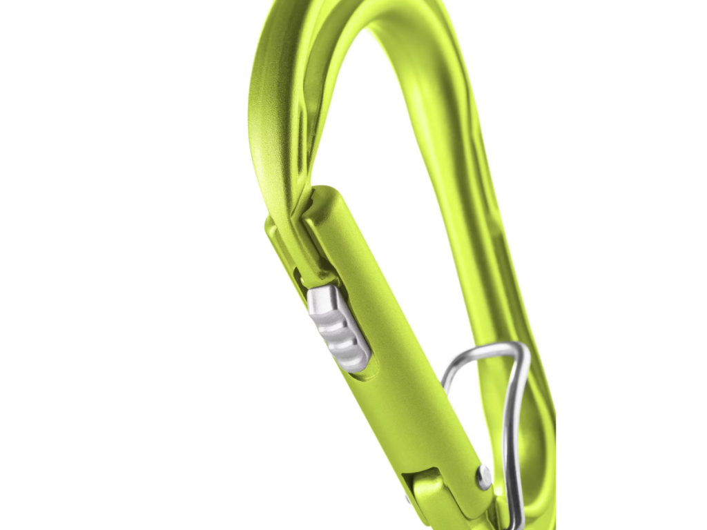- Integrated crossbar (FG): The fixation crossbar prevents the carabiner from rotating in the harness belay loop, thus maintaining optimal load on the longitudinal axis and increasing the safety of the entire system.