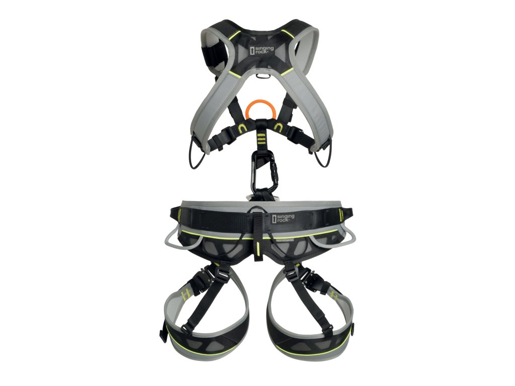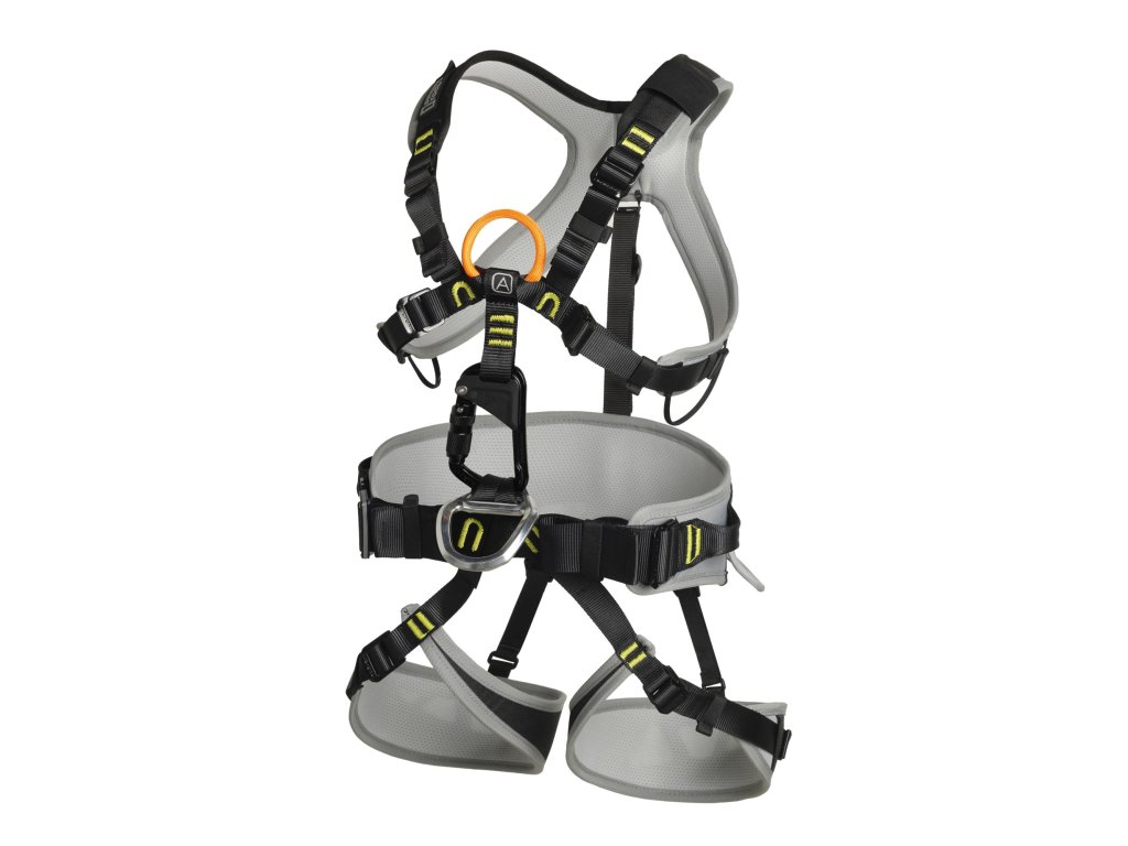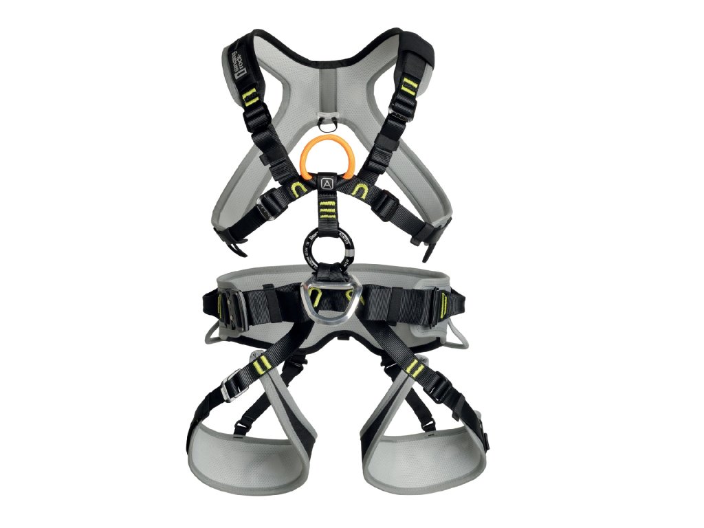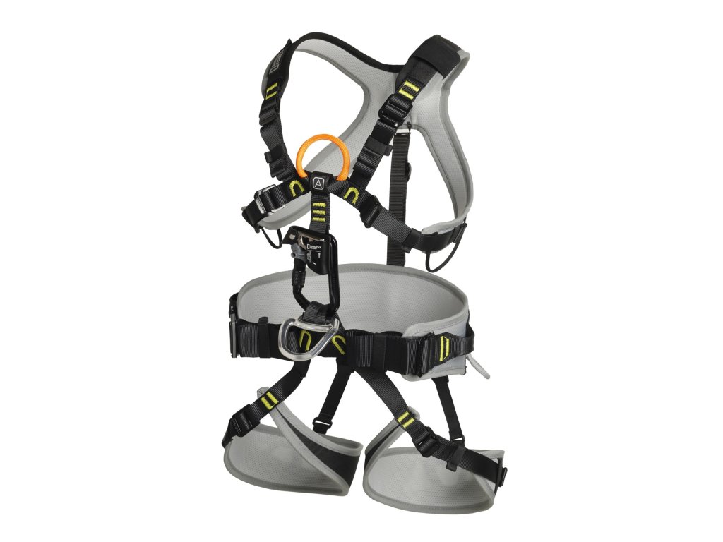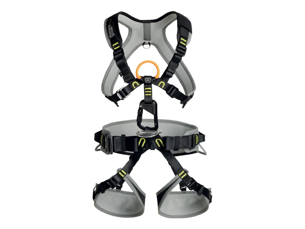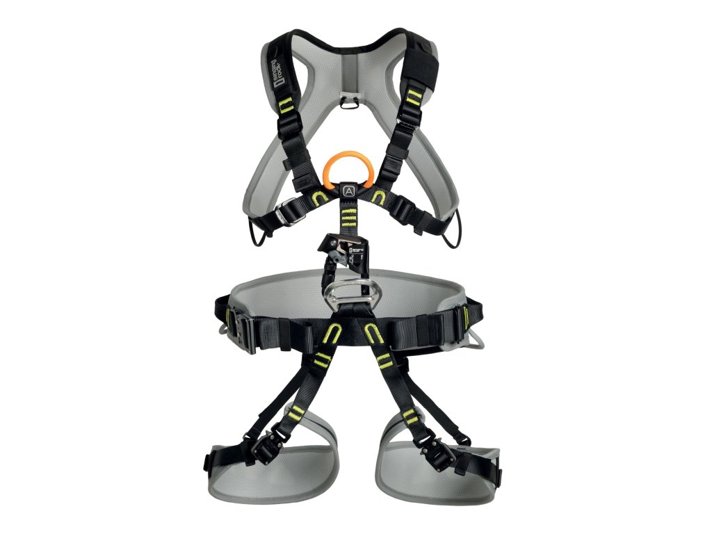 - The chest harness offers an orange textile point EN 361 for fall arrest marked with label A.
