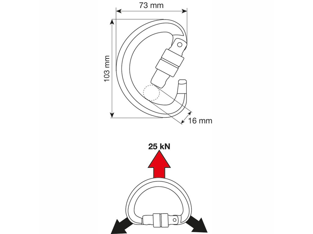 A Triad Lock egy félköríves karabiner, amelynek szilárdsága 16 kN. Három ponton történő terhelés esetén a Triad Lock 25 kN szilárdsággal rendelkezik, így ideális a mellkasi és az üléshevederek összekapcsolására (A/2 - mellkasi + 2 ágyéki csatlakozófül). Csavaros zár a könnyű kezelhetőség érdekében.