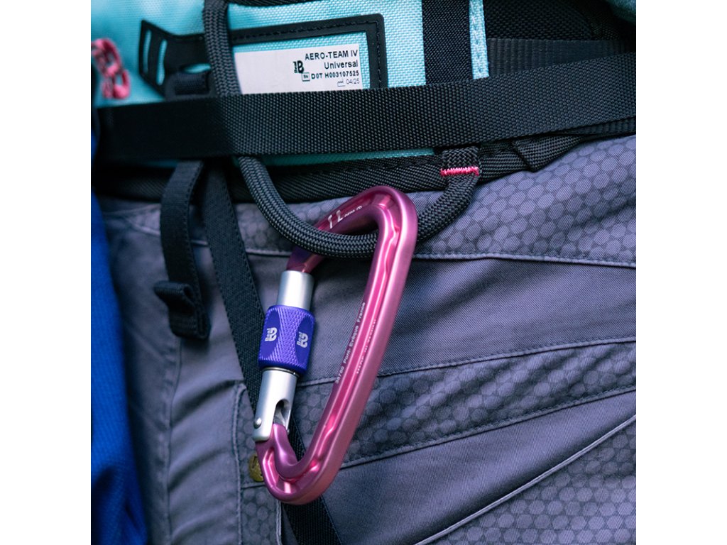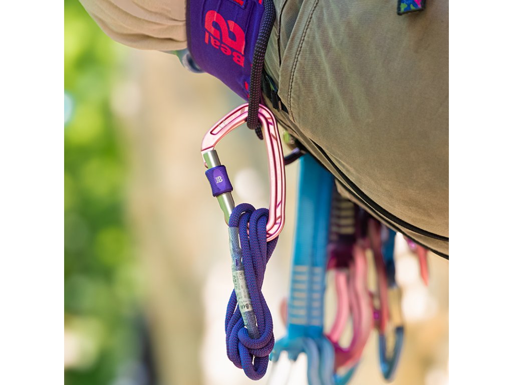 Asymetrická „D“ keylocková karabina se šroubovací pojistkou zámku, upravenou pro pevné dotažení klíčem (14). Karabina Be Quick je vhodná pro zajištění ve štandu.