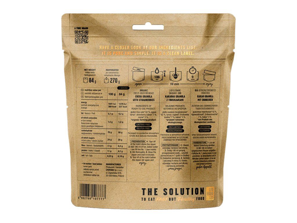 V balení nejsou žádné umělé přísady, žádné přidané cukry, žádný palmový olej a žádné konzervační látky. Jídlo je vyrobeno ze 100% přírodních surovin. Všechny suroviny jsou z ekologických farem.