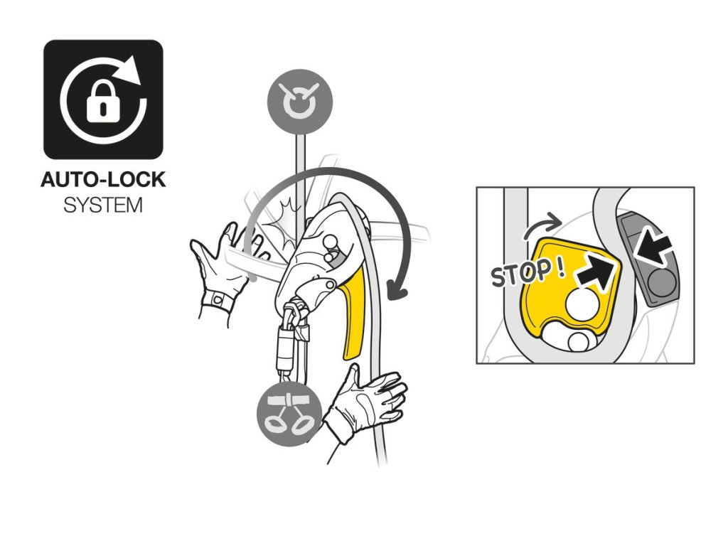 - Systém AUTO-LOCK umožňuje pracovníkovi snadné polohování na pracovním stanovišti, aniž by museli manipulovat s rukojetí nebo uvázat zajišťovací uzel: jakmile uživatel uvolní rukojeť, lano se automaticky zablokuje v zařízení