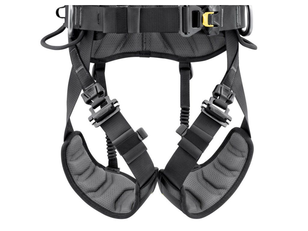 - Elastické pásky nožních popruhů (lze je vyměnit uživatelem, k dispozici jako náhradní díly) umožňují, aby postroj držel správné nastavení, ať už uživatel chodí nebo je zavěsený