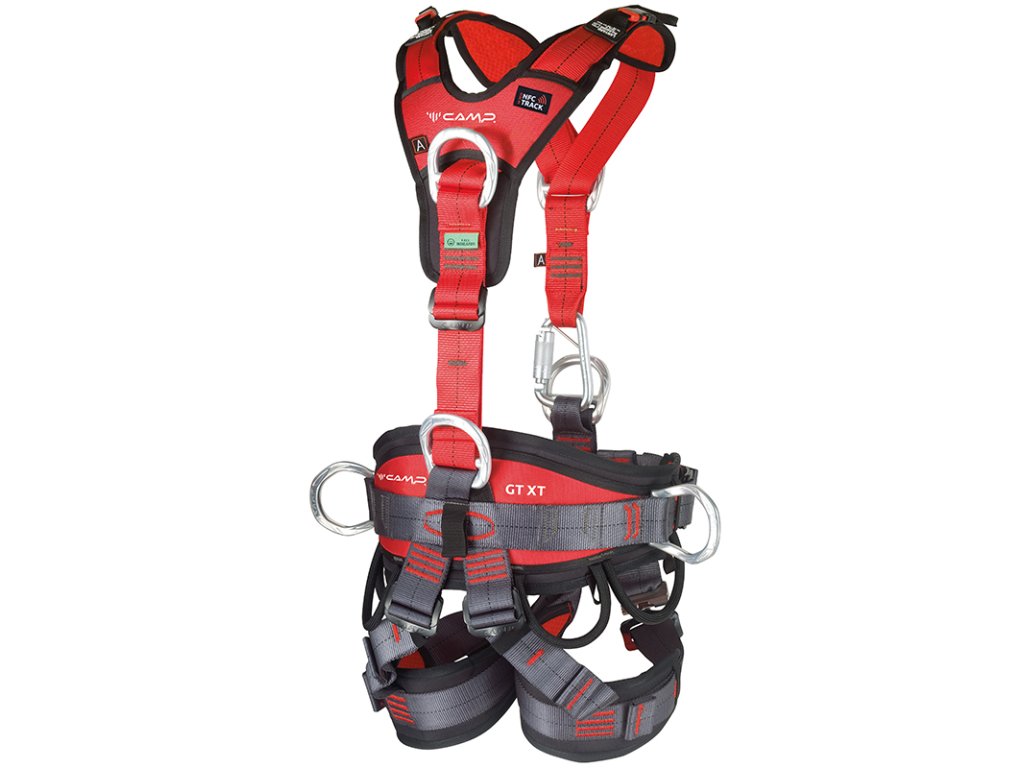 Uprząż robocza CAMP GT XT jest kontynuacją linii najlepszych uprzęży dostępu linowego. GT XT to połączenie uprzęży siedzącej CAMP GT i uprzęży piersiowejCAMP GT. Posiada modyfikacje spełniające rygorystyczne normy ANSI i jest używany przez użytkowników o wysokich wymaganiach bezpieczeństwa w wielu częściach świata dzięki podwójnej certyfikacji (ANSI + EN). CAMP GT XT został opracowany w ramach programu "SOSPESI", który zajmuje się urazami podczas długotrwałego zawieszenia na linie. Wyściółka ma różną grubość i sztywność w zależności od punktu obciążenia, dzięki czemu nacisk na uda i talię jest optymalnie rozłożony w całej uprzęży. Innowacyjne połączenie pasa biodrowego z nogawkami sprawia, że uprząż jest wygodna zarówno w pozycji wiszącej, jak i na ziemi. Uprząż CAMP GT Sit jest wyposażona w opatentowany punkt mocowania, który składa się z dwóch tekstylnych zaczepów. Górne ucho służy do mocowania uprzęży piersiowej (CAMP GT Chest), a dolne ucho oferuje aluminiowy D-ring do mocowania lonży, przyrządu zjazdowego lub innego sprzętu do liny. Inne cechy uprzęży CAMP GT XT obejmują opatentowane klamry szybkiego zwalniania ANSI STS na nogach, 6 duraluminiowych punktów mocowania - 1x klatka piersiowa A, 1x plecy A, 1x wiązanie, 2x bok do pozycjonowania i 1x tył do pozycjonowania. Uprząż na klatkę piersiową zawiera pasek regulacyjny do mocowania blokady na klatkę piersiową (np. CAMP Turbochest). Cała uprząż jest łatwo regulowana za pomocą pasków ściągających.