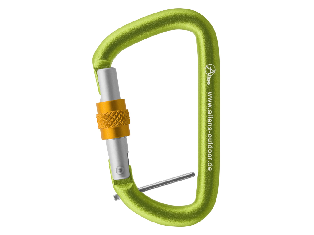 Karabiny ALIENS Alu ACCESSORY D 12 kN jsou dodávány s fixačním kolíkem, který umožňuje fixovat smyčky nebo jiné prvky v požadované poloze. Povrch je pískovaný („sandblasted“), což zajišťuje velmi příjemný úchop. Karabiny MOHOU být vybaveny fixačním kolíkem, ale NEMUSÍ. Po namontování nelze kolík již odstranit.
