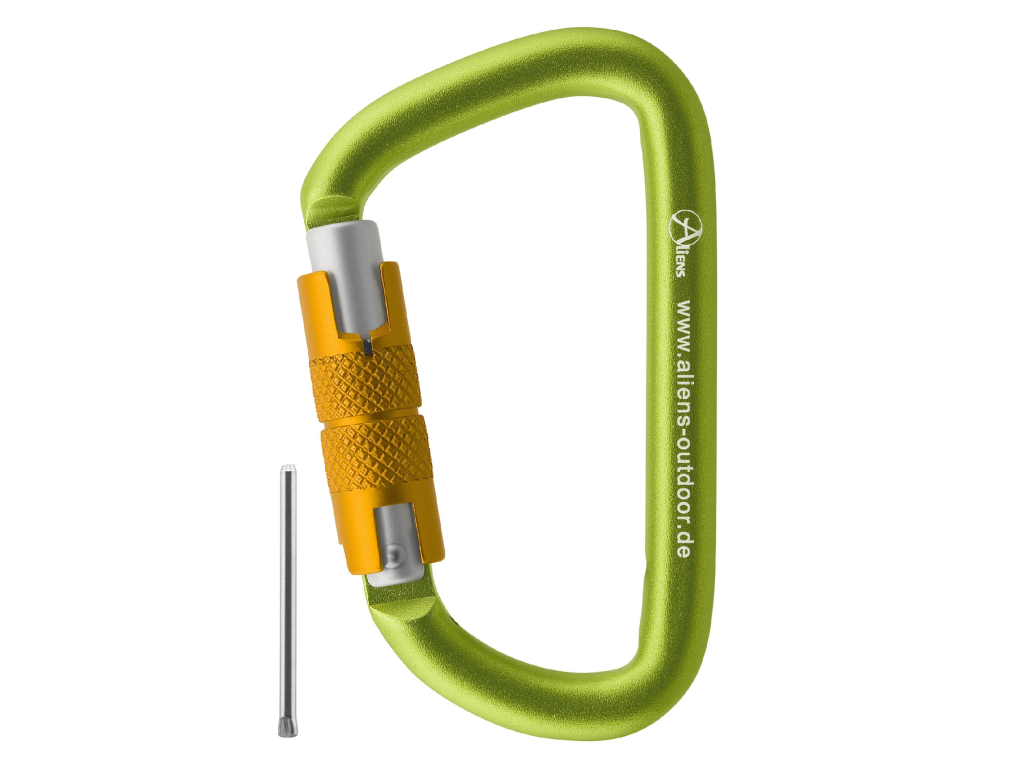 Karabiny ALIENS Alu ACCESSORY D 12 kN jsou dodávány s fixačním kolíkem, který umožňuje fixovat smyčky nebo jiné prvky v požadované poloze. Povrch je pískovaný („sandblasted“), což zajišťuje velmi příjemný úchop. Karabiny MOHOU být vybaveny fixačním kolíkem, ale NEMUSÍ. Po namontování nelze kolík již odstranit.