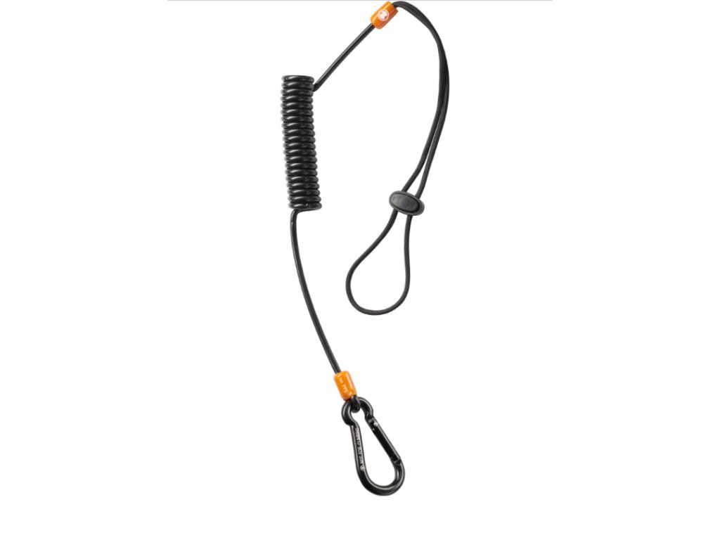 Zajištění pro zařízení do 2,3 kg, spirálové lano 55–165 cm, stabilní, odolné, karabina