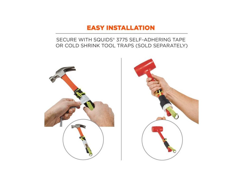 Pro nejlepší použití vyztužíte smyčkový konec ocasu nástroje samolepicí páskou Squids nebo Cold Shrink Tool Trap. K dispozici ve dvou velikostech: standard a prodloužená. Při práci ve výškách je nezbytné připoutat své nástroje. Spojovací prostředky a popruhy na ochranu proti pádu jsou částí bezpečnostního vybavení navržené tak, aby se jeden konec bezpečně připevnil k pevnému kotevnímu bodu a druhý k příslušnému připevňovacímu bodu na nářadí správným uvázáním.